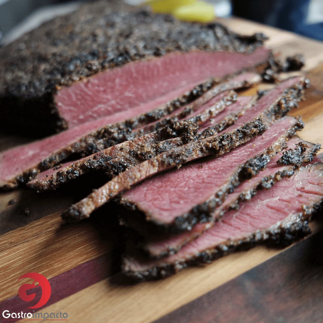 Delicioso pastrami de res, sazonado con salmuera y ahumado con un delicioso blend para darle una costra de sabor delicioso, carne curada por mas de 10 días luego del ahumado.